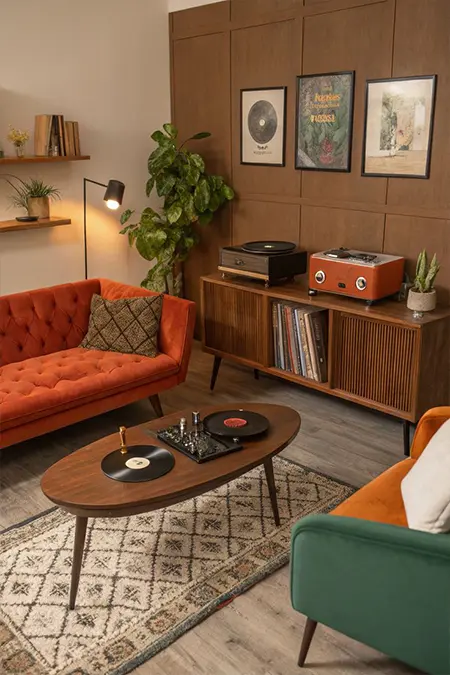 • Аксессуары: Важную роль играют детали — лампы с абажурами, старинные радиоприёмники, виниловые пластинки и постеры с изображением популярных фильмов или музыкантов.