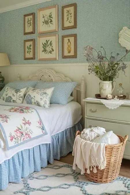 • Декор: Элементы декора включают керамические изделия, текстиль с цветочными узорами и старинные аксессуары. Часто используются корзины, свечи и живые цветы в вазах.