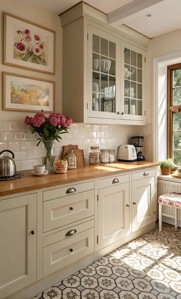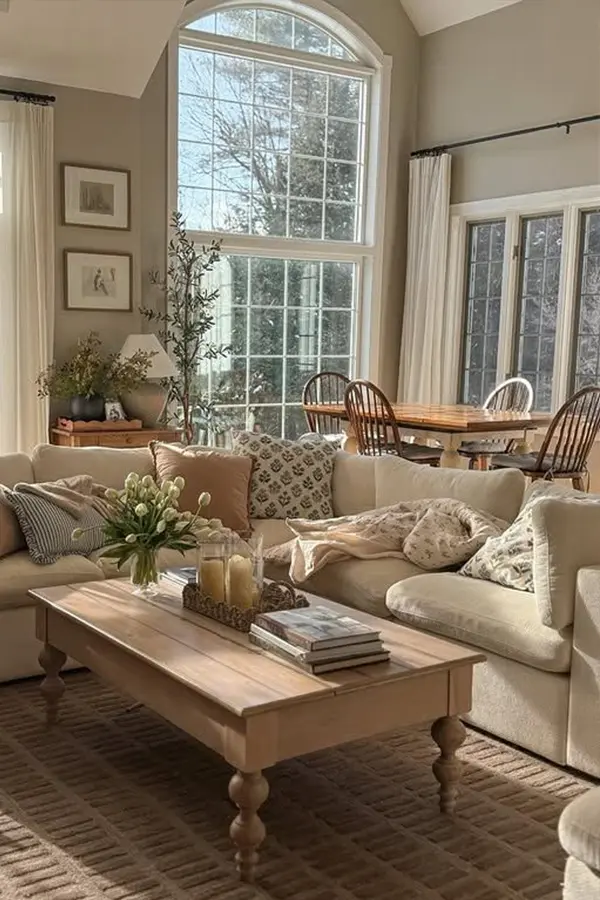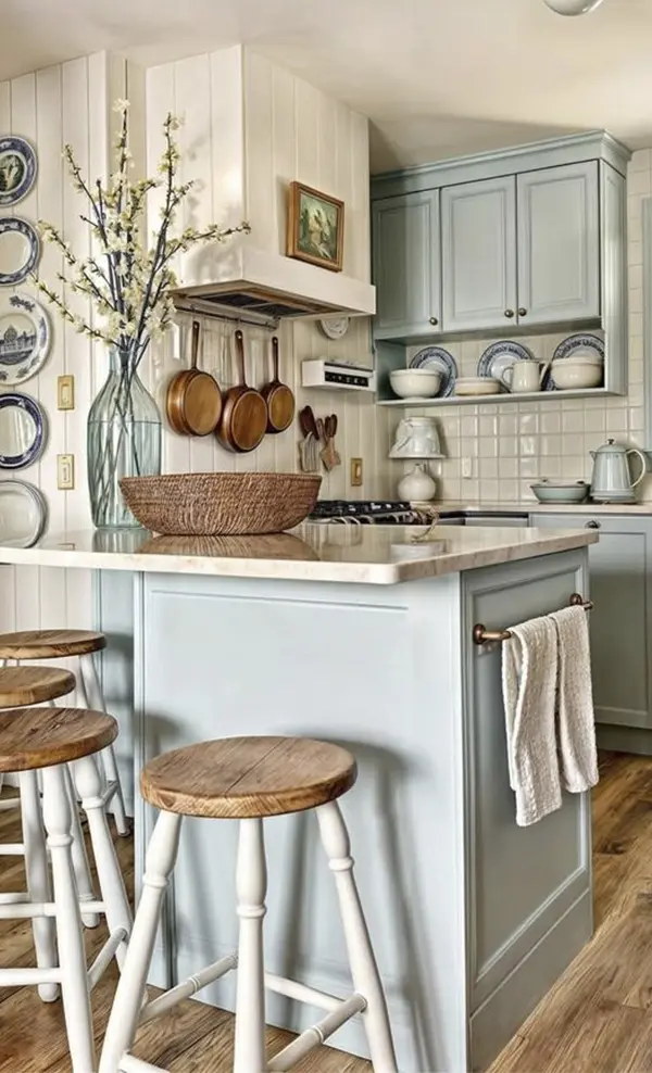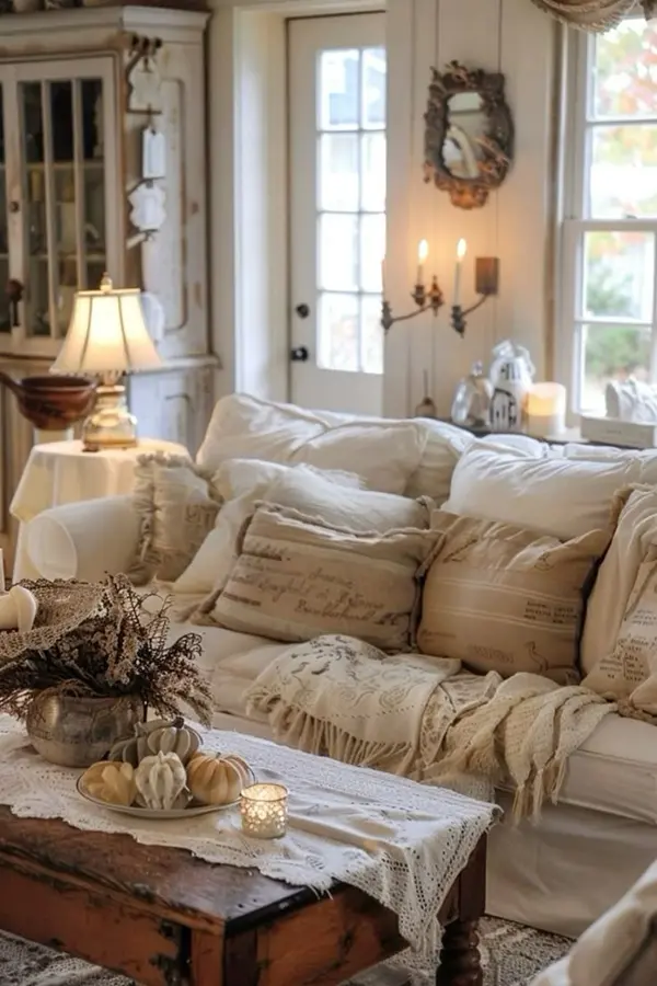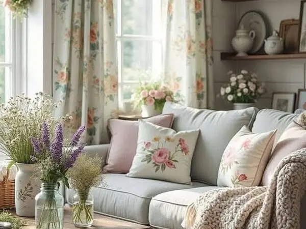 • Декор: Керамические вазы, плетеные корзины, сухоцветы, винтажные предметы, картины с пейзажами.