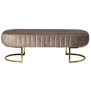 Элегантная дизайнерская банкетка покоряет красотой и удобством. Изысканный оттенок стеганой велюровой обивки в сочетании с золотистыми ножками необычной формы придает банкетке богемный вид. Округлые формы и нежнейший велюр просто созданы для спальни или будуара. Банкетка будет уместна как в изножье кровати, так и в комбинации с кофейным столиком подходящего дизайна. Необыкновенно аристократично банкетка будет выглядеть в холле или просторной прихожей, чтобы вы и ваши гости могли присесть или переобуться с комфортом.