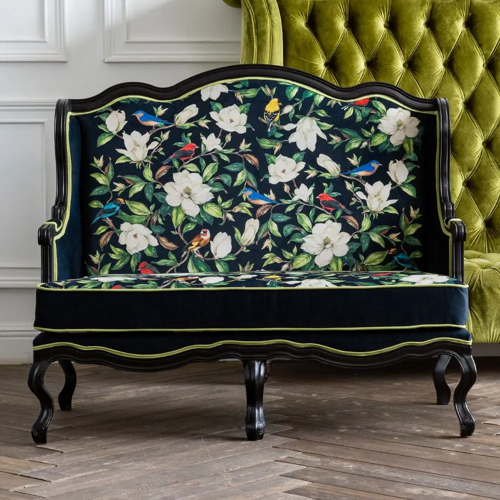 Двухместный диван «Цветущая аристократка» – фаворит в одноименной коллекции. Цветы магнолии и яркие птицы на его сидении и спинке делают этот интерьерный экспонат поистине уникальным. А черный цвет каркаса дивана наполнит ваш дом задумчивой роскошью. Одни выбирают предметы мебели для шумных дружественных веселий, другие, напротив, ищут романтического уединения в интерьере – и для того, и для другого диван из коллекции «Цветущая аристократка» подходит идеально. Вставать с этого дивана вам, однозначно, не захочется! «Объект мечты» это гарантирует! Не зря драгоценности всегда стараются дарить в коробочках, обрамлённых чёрным бархатом. Этот цвет поистине является идеальным фоном для того, чтобы привлечь внимание к важным деталям. Именно этот принцип и использовали дизайнеры «Объекта мечты», создавая этот роскошный интерьерный экземпляр. Черный цвет каркаса дивана «Цветущая аристократка», контрастируя с яркой обивкой сиденья и спинки, поистине уникален. Черный диван, как и знаменитое «маленькое черное платье», неимоверным образом будет притягивать к себе взоры ваших гостей. А уж если вы хотите добавить немного ярких красок, тогда набросайте на него пестрых подушек из этой же коллекции! Благодаря своей универсальности двухместный диван «Цветущая аристократка» можно использовать повсеместно. Его можно установить в гостиной, на веранде, в беседке. Этот диван найдет свое место и в офисных помещениях. Диван «Цветочная аристократка», снабженный высокой спинкой, глубоким сиденьем, плавными подлокотниками и изысканной обивкой, способствует удобной позе, расслабленному отдыху и комфорту в целом. Цвет обивки обещает гармонию с любым интерьерным окружением. Кроме эффектно цветущей магнолии на обивке дивана, этот предмет запомнится нашим интерьерам ярким оперением чудесной птицы, присевшей на ветку эффектного цветка. Черный цвет каркаса поистине уникален, он великолепно гармонирует абсолютно с любым фоном. Богемная внешность обивки не исключает практичность: ткань долговечна и неприхотлива, для ухода пригодны любые чистящие средства для мебели. Ткань прочная, не лоснится, долго сохраняя мягкость и бархатистость. Корпус изготовлен из натурального бука. Среди европейских пород дерева бук считается самым прочным и долговечным материалом. Плотность буковой древесины составляет 720 кг/м³. Эти деревья растут длинными стволами без сучьев. Это обеспечивает широкую, плотную и однородную структуру ядровой древесины, максимально благоприятной для производства мебели и резьбы по дереву. Резьба играет здесь ведущую роль: диван украшен изящными желобками, формирующими классический силуэт эпохи Луи-Филиппа. Мебель от «Объекта мечты» – романтичный образ, совершенство красок природы, с цветущим аристократизмом и утонченным образом!