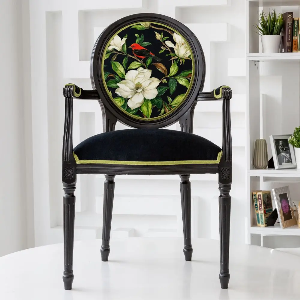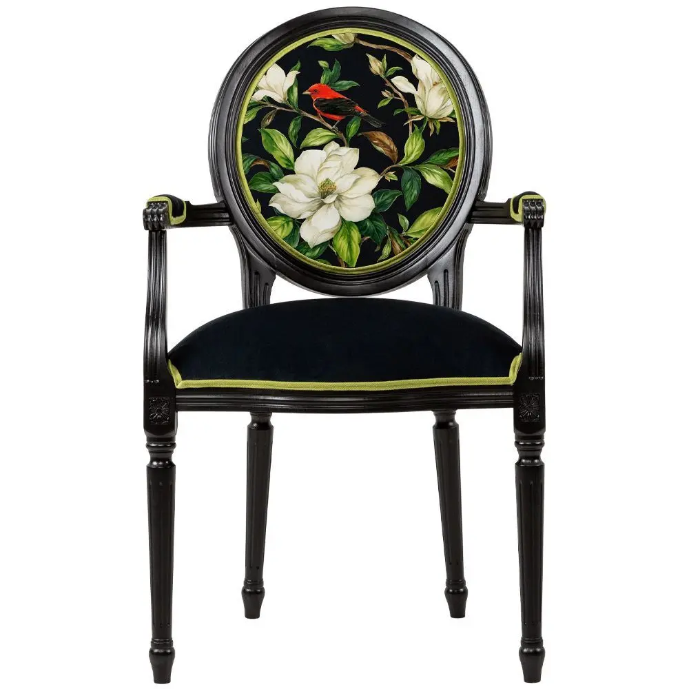 Полукресло «Цветущая аристократка» – яркий участник новой коллекции и просто идеальная кандидатура для прекрасной интерьерной обстановки. Утонченный стан, обивочная ткань цвета темной ночи с цветущей магнолией, утопающей в зеленой листве, райская птица с театральным оперением – этот предмет мебели вряд ли возможно оставить без внимания. Черный цвет каркаса полукресла «Цветущая аристократка», контрастируя с яркой обивкой сиденья и спинки, поистине уникален. Черный диван, как и знаменитое «маленькое черное платье», неимоверным образом будет притягивать к себе взоры ваших гостей. «Объект мечты» гарантирует – полукресло «Цветущая аристократка» сделает интерьер эффектным и модным! Кресла и стулья со спинками-медальонами появились в XVIII веке, на излете последнего из «королевских» стилей. Революция и Марсельеза и войны – это все будет после. А сейчас – утонченная беседа, увлечение античностью, нежные звуки клавесина. «Наслаждайтесь сегодняшним днем!» – говорит это изящное креслице. Черный цвет – герой современных интерьеров! Полукресло «Цветущая аристократка» гармонично впишется в любой интерьерный стиль. В сочетании с другими предметами интерьера оно сделает комнату стильной и элегантной! Цвет обивки обещает гармонию с любым интерьерным окружением. Кроме эффектно цветущей магнолии на обивке кресла, этот экземпляр запомнится нашим интерьерам ярким оперением чудесной птицы, присевшей на ветку эффектного цветка. Черный цвет каркаса поистине уникален, он великолепно гармонирует абсолютно с любым фоном. Богемная внешность обивки не исключает практичность: ткань долговечна и неприхотлива, для ухода пригодны любые чистящие средства для мебели. Ткань прочная, не лоснится, долго сохраняя мягкость и бархатистость. Корпус изготовлен из натурального бука. Среди европейских пород дерева бук считается самым прочным и долговечным материалом. Плотность буковой древесины составляет 720 кг/м³. Эти деревья растут длинными стволами без сучьев. Это обеспечивает широкую, плотную и однородную структуру ядровой древесины, максимально благоприятной для производства мебели и резьбы по дереву. Резьба играет здесь ведущую роль: кресло украшено изящными желобками, формирующими классический силуэт эпохи Луи-Филиппа. Мебель от «Объекта мечты» – романтичный образ, совершенство красок природы, с цветущим аристократизмом и утонченным образом!